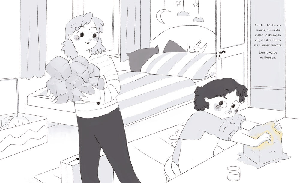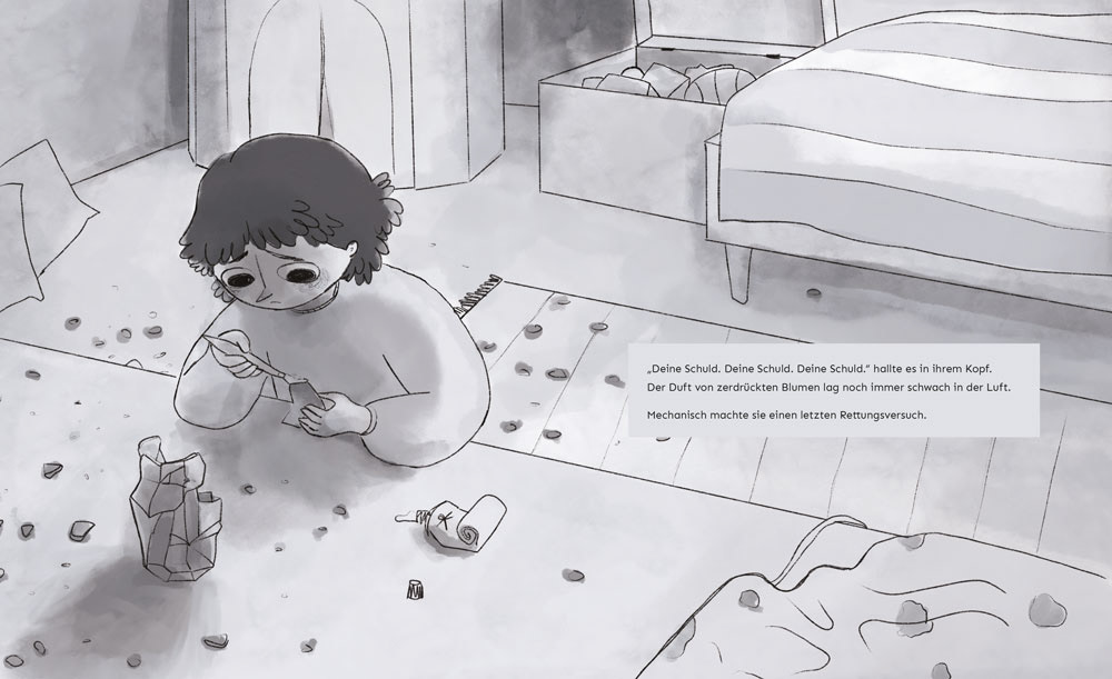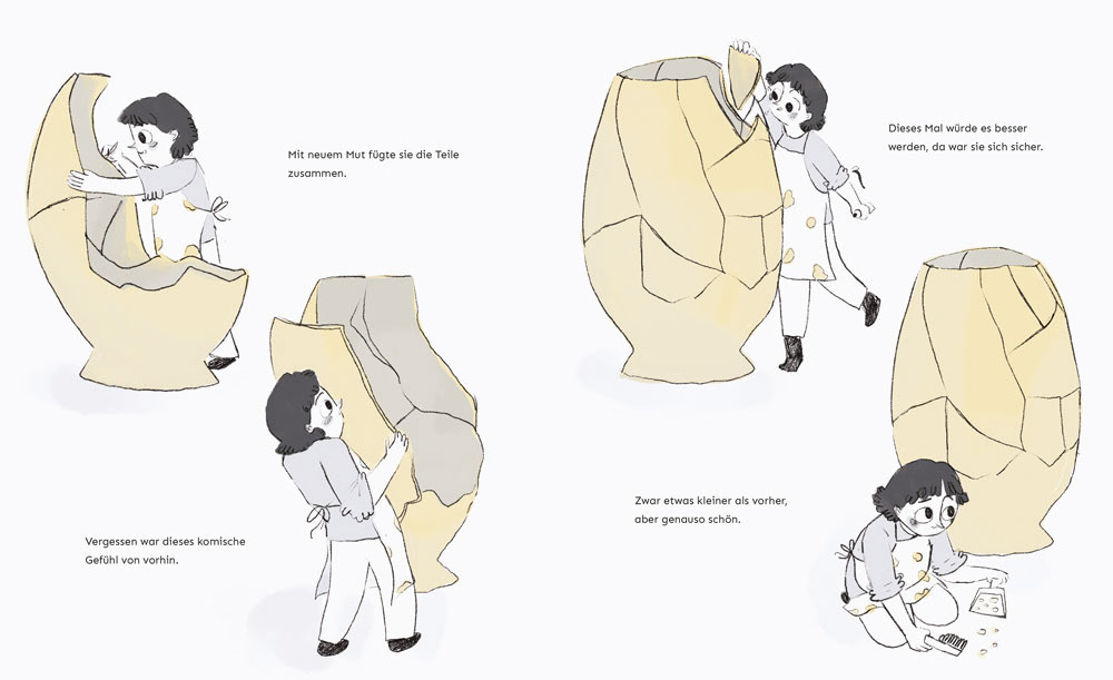 Von Blumen und Scherben Ein metaphorisches Bilderbuch über Trauma, Kindheit und innere Stärke. In „Von Blumen und Scherben“ erzähle ich in symbolischer Bildsprache von meiner Kindheit in einem gewaltvollen familiären Umfeld. Die Geschichte bleibt dabei bewusst offen – es gibt keine Namen, keine konkreten Orte, sondern Bilder und Metaphern, die Raum für eigene Assoziationen lassen. Im Zentrum steht ein Mädchen, das eine Vase formt – ein Sinnbild für sich selbst, ihre Fantasie, Verletzlichkeit und den Wunsch nach Anerkennung. Die Vase wird immer wieder zerstört – und mit ihr ein Teil ihres Selbst. Dennoch entsteht aus den Scherben etwas Neues, etwas Starkes. Ein besonderes Gestaltungselement sind Klappseiten an Schlüsselpunkten der Geschichte, die den Lesenden zusätzliche Ebenen eröffnen und das Eintauchen in die Bildwelt intensivieren. Diese Arbeit war für mich ein Weg, das Unsagbare in Bilder zu fassen. Das Buch richtet sich an Menschen, die sich in solchen Erfahrungen wiederfinden – durch eigenes Erleben oder durch Empathie. Es ist als Kinderbuch für Erwachsene konzipiert.
